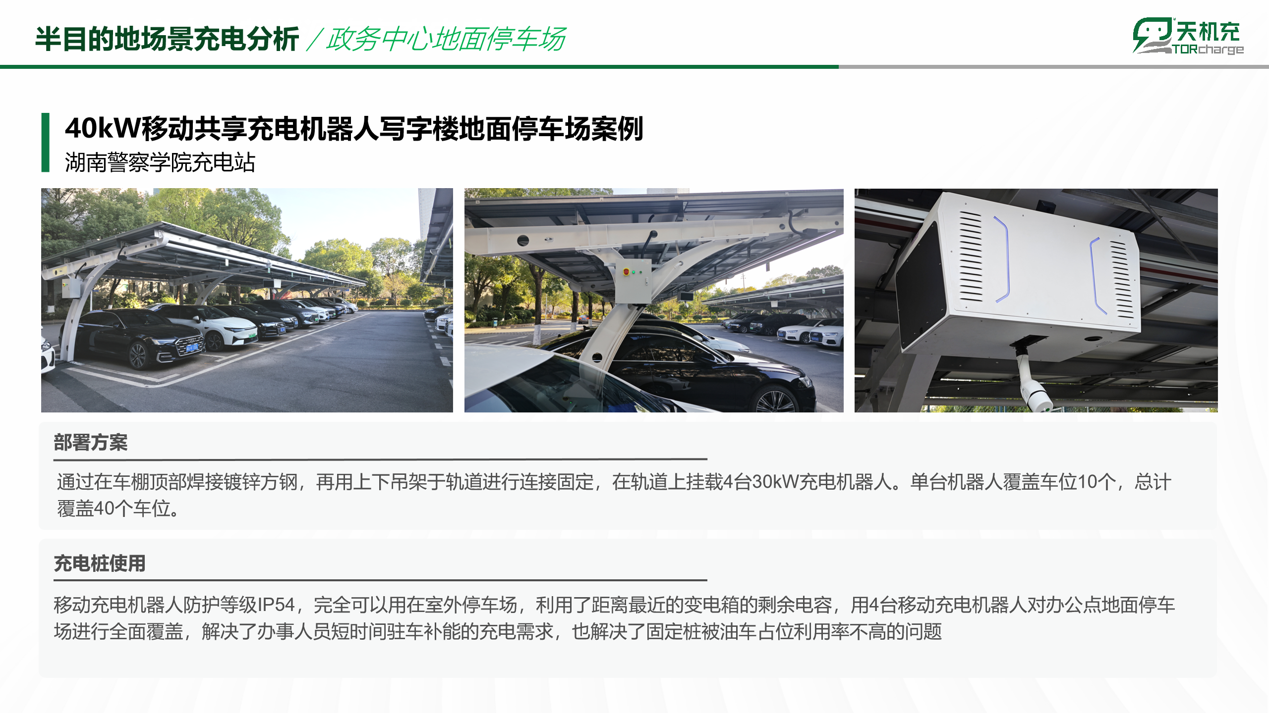 移动轨电机器人充电解决方案 通过在车库顶部部署轨道系统,结合机器人控制技术和物联网技术,为电动汽车提供方便、高效的充电服务。与传统的“车找桩”模式相比,移动轨道充电机器人实现了“桩找车”,大幅提高了充电桩的利用效率,解决了充电桩一“桩”难求的问题。该系统通过共享充电模式,减少了充电设施的投资成本,同时根据车辆情况灵活增减,以满足充电需求。