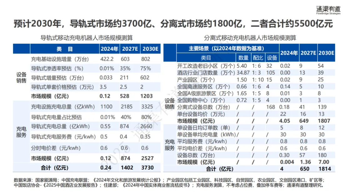 该报告分析指出,未来补能格局将形成“固充为主、换电为辅、移充新兴”的三足鼎立态势。其中,导轨式移动充电机器人将对固定充电桩实现有效替代,解决其“利用率低、经济性差”等沉疴。根据报告预测,2030年全球移动充电服务市场规模将突破5500亿元(含移动充电桩导轨式、储能小车分离式等形态在内)。